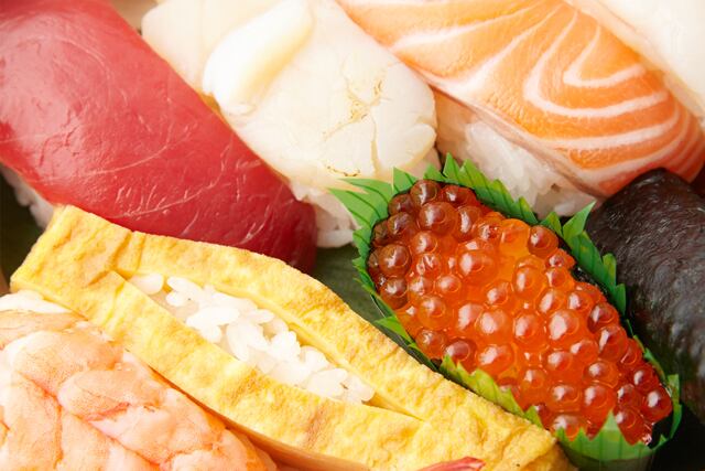 おしながき 酢飯、鮪、サーモン、帆立、蒸し海老、穴子、玉子、鱒卵、鉄火巻、特製太巻、がり